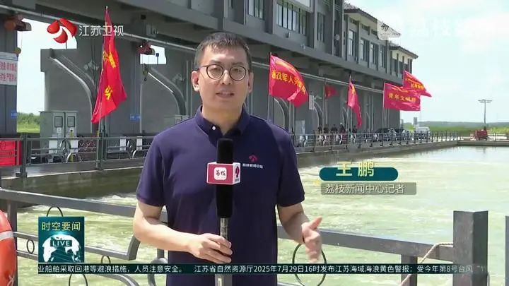 荔枝新聞中心記者王鵬說:“在淮河入海水道金湖控制線東偏泓,50臺臨時泵站正全力翻水,以12.5立方米每秒的流量全力抽引水源補給洪澤湖。”