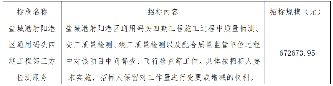 ⑴項(xiàng)目名稱:鹽城港射陽(yáng)港區(qū)通用碼頭四期工程第三方檢測(cè)服務(wù)