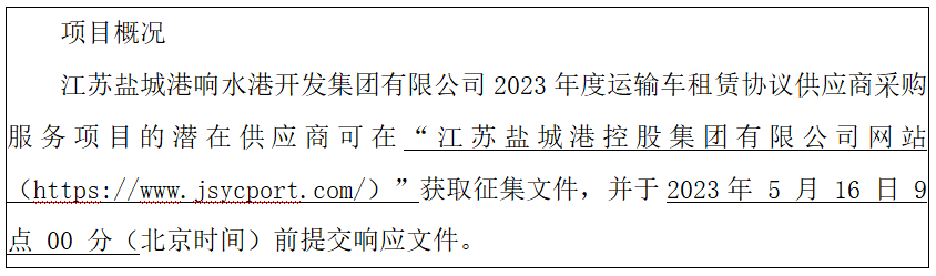 江蘇鹽城港響水港開發(fā)集團(tuán)有限公司現(xiàn)就江蘇鹽城港響水港開發(fā)集團(tuán)有限公司2023年度運(yùn)輸車租賃協(xié)議供應(yīng)商采購服務(wù)項(xiàng)目征集供應(yīng)商,歡迎符合條件的供應(yīng)商參加本次框架協(xié)議采購活動。