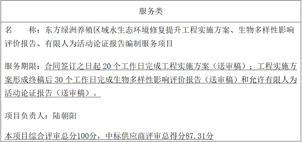 二、項(xiàng)目名稱(chēng):東方綠洲養(yǎng)殖區(qū)域水生態(tài)環(huán)境修復(fù)提升工程實(shí)施方案、生物多樣性影響評(píng)價(jià)報(bào)告、有限人為活動(dòng)論證報(bào)告編制服務(wù)項(xiàng)目
