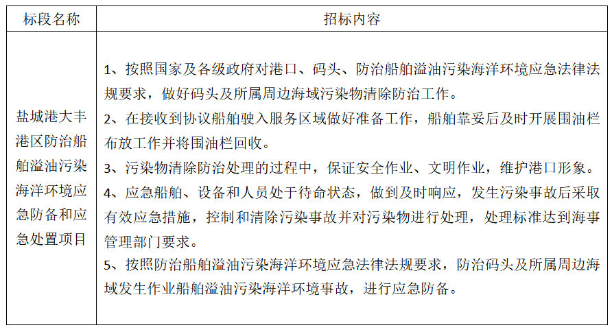 1、項(xiàng)目名稱:鹽城港大豐港區(qū)防治船舶溢油污染海洋環(huán)境應(yīng)急防備和應(yīng)急處置項(xiàng)目