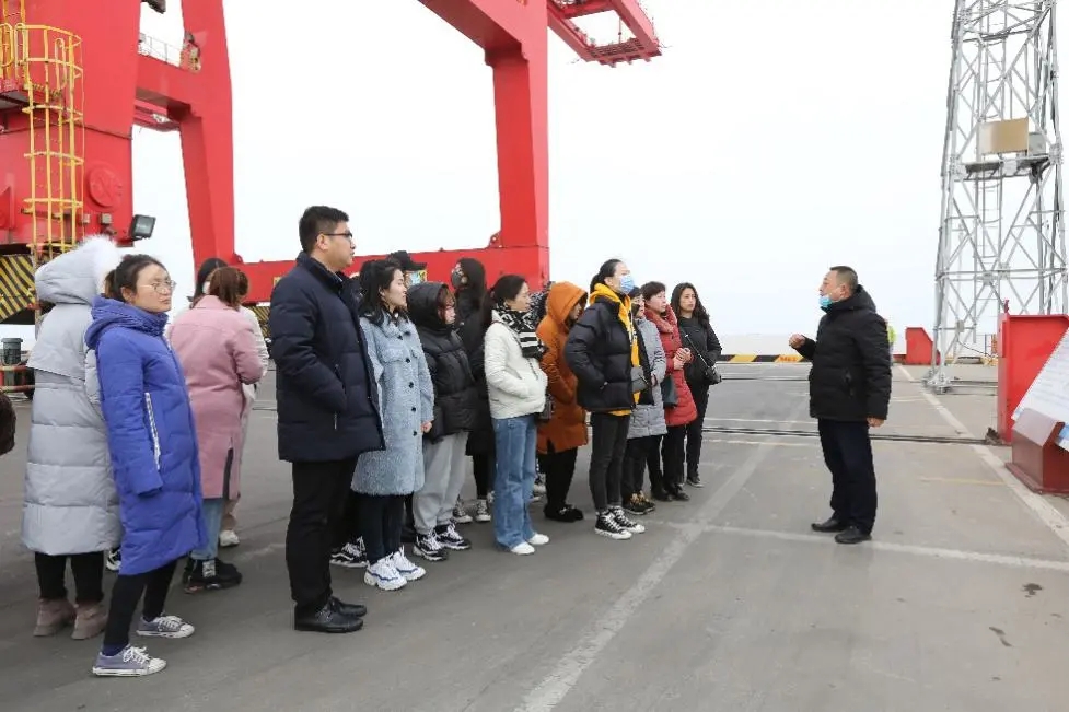濱海港區(qū)單位女職工在生產(chǎn)經(jīng)營部工作人員的帶領(lǐng)下,學(xué)習(xí)門機(jī)進(jìn)行裝卸作業(yè),了解碼頭從船舶靠岸的前期準(zhǔn)備到靠泊后的裝卸作業(yè)的全部流程。