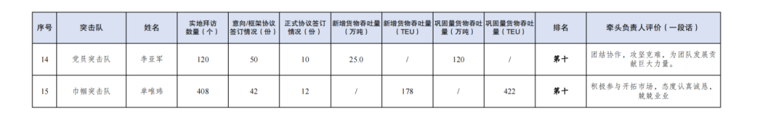 1.累計拜訪客戶數(shù)量16022家:其中多式聯(lián)運(yùn)第二突擊隊3167家,多式聯(lián)運(yùn)第一突擊隊3048家,大豐港區(qū)突擊隊1846家,響水港區(qū)突擊隊955家,巾幗突擊隊926家,青年突擊隊913家,黨員突擊隊887家,射陽港區(qū)突擊隊840家,航運(yùn)集團(tuán)突擊隊805家,濱海港區(qū)突擊隊714家,阜寧港區(qū)突擊隊692家,建湖港區(qū)突擊隊627家,亭湖港區(qū)突擊隊602家。