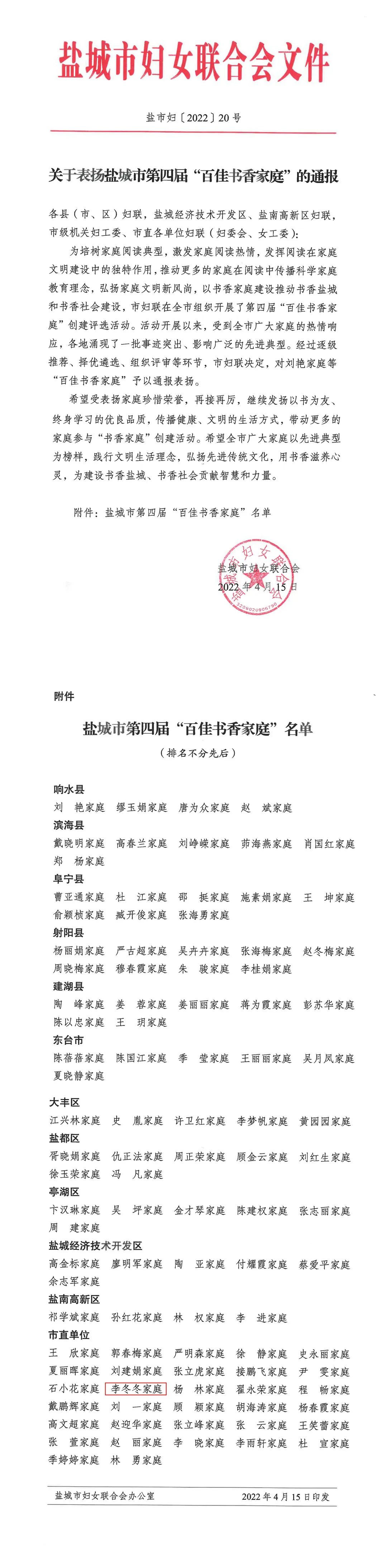 好消息!集團職工李冬冬家庭榮獲鹽城市“百佳書香家庭”稱號
