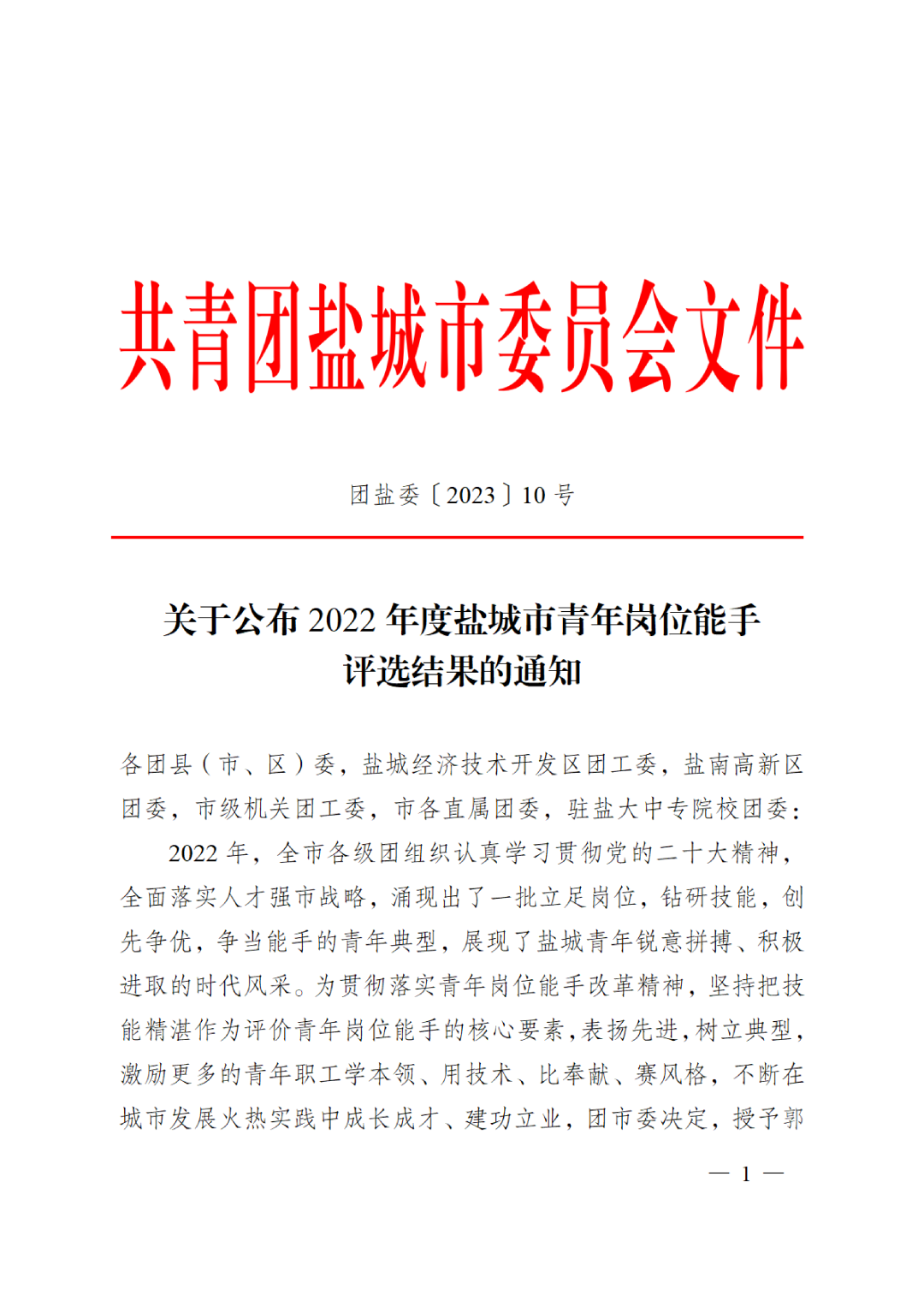 近日,共青團(tuán)鹽城市委發(fā)布《關(guān)于公布2022年度鹽城市青年崗位能手評選結(jié)果的通知》,集團(tuán)丁浩明、龔海衛(wèi)、李睿三名青年同志榮獲“2022年度鹽城市青年崗位能手”稱號。