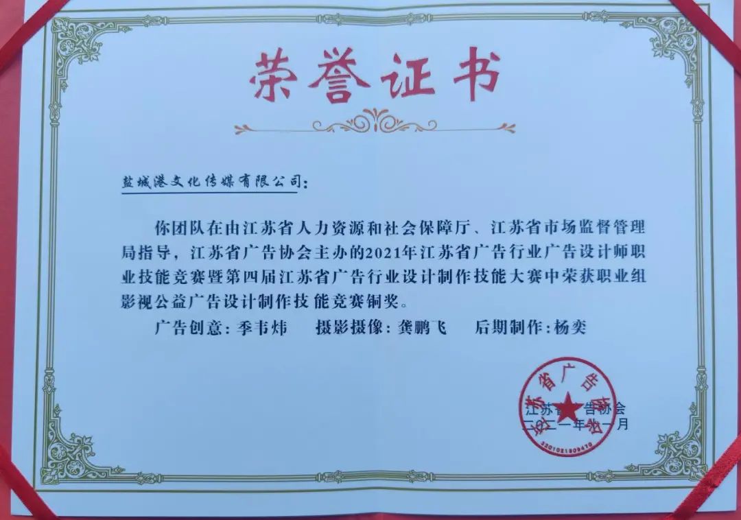 11月28日,從2021年江蘇省廣告行業(yè)廣告設(shè)計(jì)師職業(yè)技能競(jìng)賽暨第四屆設(shè)計(jì)制作技能大賽上傳來(lái)好消息,由江蘇鹽城港文化傳媒有限公司選送的參賽選手,經(jīng)過(guò)現(xiàn)場(chǎng)理論、實(shí)際創(chuàng)作等環(huán)節(jié)的比拼,在此次省級(jí)一類大賽中分別獲得職業(yè)組平面公益廣告設(shè)計(jì)銅獎(jiǎng)、職業(yè)組影視公益廣告設(shè)計(jì)制作銅獎(jiǎng),為公司進(jìn)一步提升品牌影響力增添了濃墨重彩的一筆,為“50天大比武活動(dòng)”交上了一份優(yōu)異的答卷。