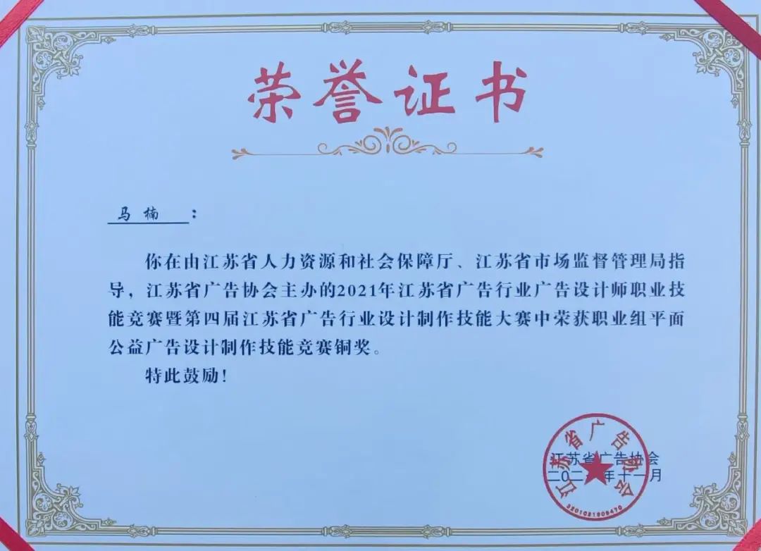 此次大賽是第四屆江蘇省百萬(wàn)技能人才技能競(jìng)賽崗位練兵活動(dòng)其中一項(xiàng)重要賽事,由江蘇省人力資源和社會(huì)保障局、江蘇省市場(chǎng)監(jiān)督管理局、江蘇省廣告協(xié)會(huì)聯(lián)合舉辦,以“永遠(yuǎn)跟黨走”競(jìng)賽主題,內(nèi)容包含廣告專業(yè)理論知識(shí)考試和技能實(shí)操競(jìng)賽,來(lái)自全省各市區(qū)130多支代表隊(duì)參加角逐。其中,文化傳媒公司5名參賽選手在理論知識(shí)考試和技能實(shí)操競(jìng)賽成績(jī)中取得優(yōu)異成績(jī),均獲得三級(jí)廣告設(shè)計(jì)師職業(yè)技能等級(jí)證書(shū)。