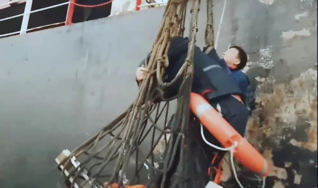 聽聞呼救聲后,碼頭負責人嚴浩當機立斷,一聲令下,立即啟動救人應急預案,現場職工陳炳銀、花衛軍和高健翔等人迅速、果斷開展救援。考慮到海水溫度低,衣服濕透增加重量后落水者體力消耗極快,無法通過救生繩進行自救,便用救生繩系住救生圈拋至海中進行營救。