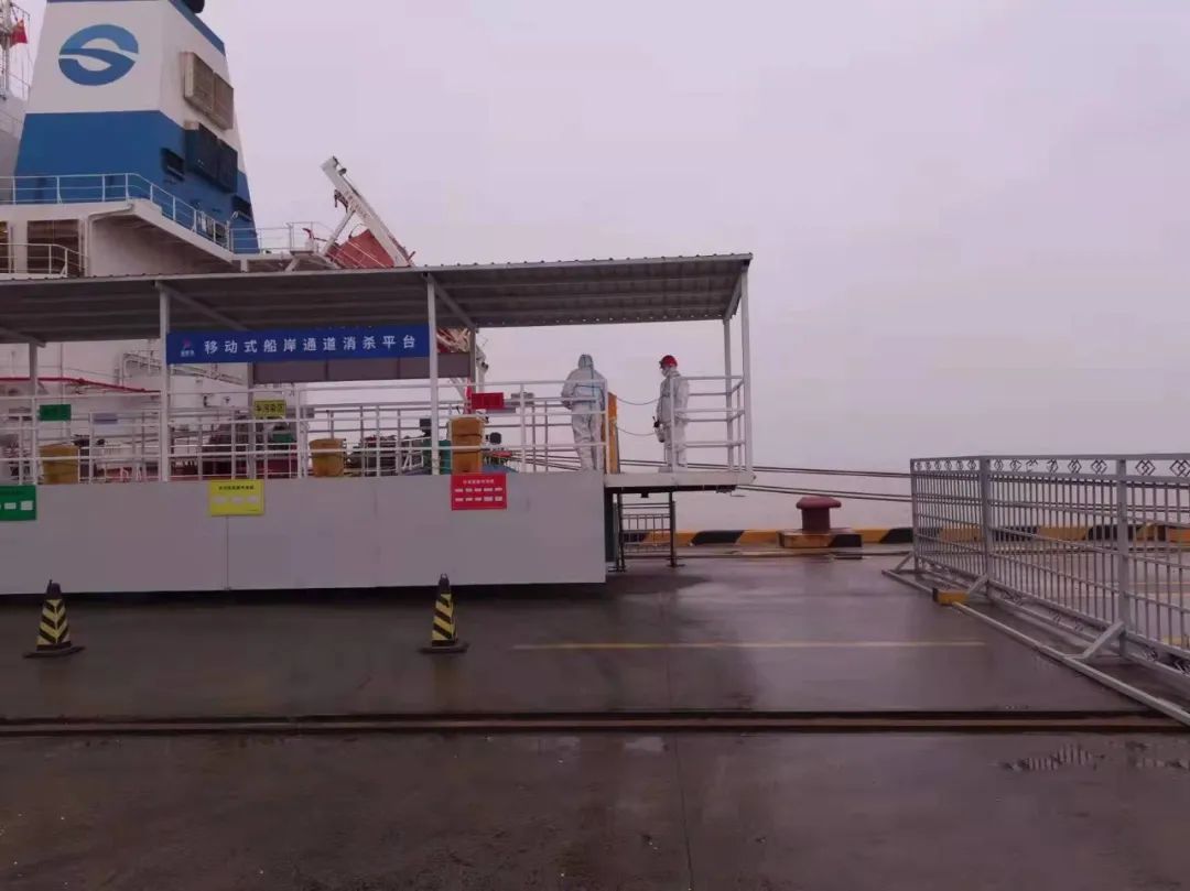 嚴(yán)格執(zhí)行人員準(zhǔn)入制度,進(jìn)出人員需佩戴口罩,并進(jìn)行體溫測(cè)量、信息登記、蘇康碼及行程碼核查。安排專(zhuān)人定時(shí)對(duì)碼頭登梯口、防疫值守崗?fù)?、脫卸區(qū)、專(zhuān)班集中居住區(qū)、專(zhuān)班人員運(yùn)輸車(chē)輛、電梯、門(mén)把手、食堂等重點(diǎn)場(chǎng)所進(jìn)行清潔消毒。碼頭設(shè)立固定的巡查人員24小時(shí)巡查,同時(shí)外輪靠泊期間,嚴(yán)格落實(shí)卡口、登輪梯口24小時(shí)專(zhuān)人值守,強(qiáng)化梯口管理,對(duì)所有登輪人員進(jìn)行核實(shí)登記,監(jiān)督人員防護(hù)措施落實(shí)情況,凡是通過(guò)梯口人員,必須提供48小時(shí)內(nèi)有效核酸檢測(cè)證明、疫苗接種證明。