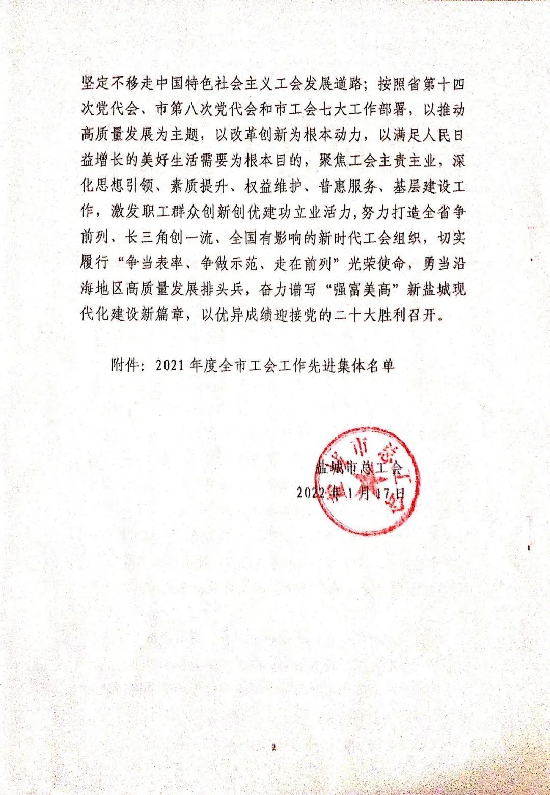 1月17日,在鹽城市總工會七屆二次全委(擴大)會議上傳來喜訊,集團工會聯合會被授予2021年度全市工會工作“先進集體”榮譽稱號。