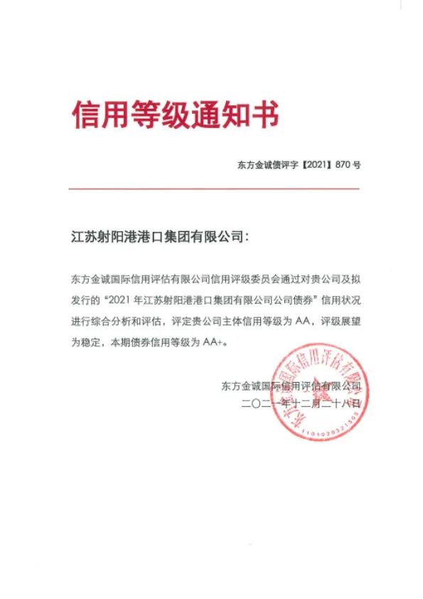 近日,經過國內權威信用評級機構的綜合分析與評估,江蘇鹽城港射陽港開發集團有限公司榮獲AA級主體信用評級,評級展望為穩定,成為繼江蘇大豐海港控股集團有限公司之后,鹽城港集團合并范圍下屬內第二家AA級主體信用評級子公司。