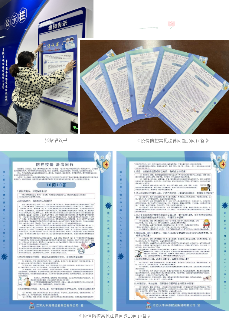 按照“該亮亮起來(lái)、該響響起來(lái)、該貼貼起來(lái)、該發(fā)發(fā)到位”的防疫宣傳要求,大豐港區(qū)運(yùn)用“網(wǎng)、端、微、屏”等媒體平臺(tái),全方位、多聲部宣傳《防控新冠肺炎疫情相關(guān)注意事項(xiàng)》《中華人民共和國(guó)傳染病防治法》等法律法規(guī),做到普法宣傳全覆蓋,并將疫情防控宣傳資料、《疫情防控常見(jiàn)法律問(wèn)題10問(wèn)10答》等材料發(fā)放到各級(jí)子公司,要求在重點(diǎn)場(chǎng)所張貼“防控疫情、法治同行”、“全民佩戴口罩”的宣傳海報(bào),依法強(qiáng)化新型冠狀病毒感染的肺炎疫情防控,切實(shí)履行疫情防控普法宣傳責(zé)任,為堅(jiān)決打贏疫情防控阻擊戰(zhàn)創(chuàng)造良好法制氛圍。
