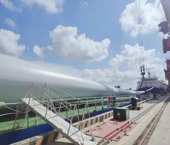 據了解,該型號風電葉片對集港運輸及裝船吊運標準要求較高。射陽港區在認真落實疫情防控各項措施的基礎上,與物流單位中悅大件公司密切配合,在裝卸前認真做好各項準備工作,制定詳細作業方案,選派精干力量組建作業專班,憑借高超的重大件吊裝技藝,僅用45分鐘便圓滿成功完成99米風電葉片裝卸的平穩裝船。優質高效的風電設備裝船能力得到各方高度認可和一致好評,再一次擦亮了射陽港區“風電裝卸服務”優質品牌,以實際行動助力風電產業的發展。
