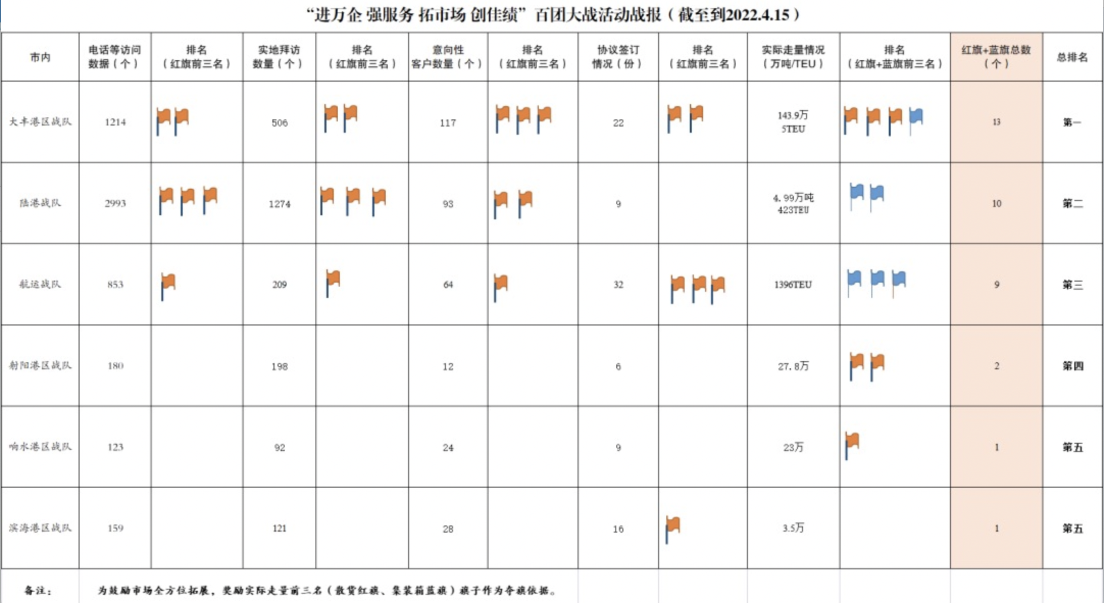 各戰隊拜訪客戶11156家,其中實地拜訪客戶2564家,電話、視頻、郵件等方式拜訪8592家,其中意向客戶445家,協議簽訂109份(其中云簽約19份),實際走量244.69萬噸(其中云簽約10萬噸),集裝箱1854TEU(其中云簽約153TEU)。