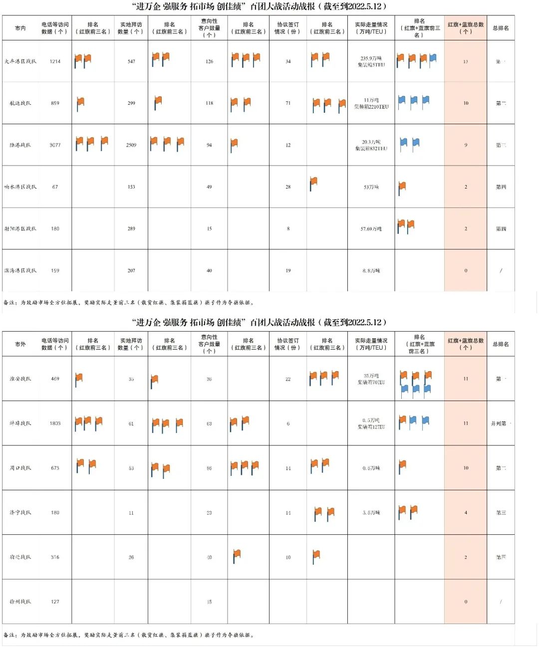 各戰(zhàn)隊累計拜訪客戶數(shù)據(jù)13314家,其中電話、視頻等訪問9124家,實地拜訪4190家,意向性客戶705家,簽訂協(xié)議238份,實際走量428.19萬噸、3129TEU。具體細分如下: