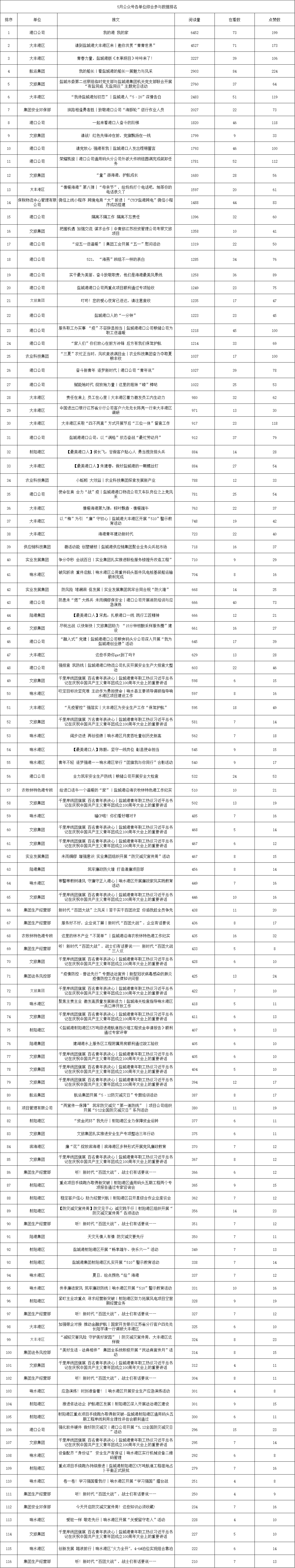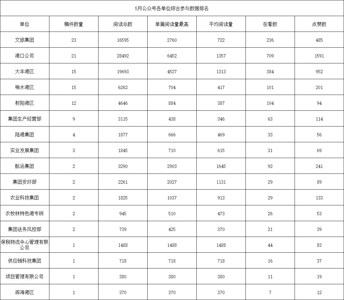 5月,集團微信公眾號共發布116篇文章。總體閱讀數約9.5萬,各單位發稿更加活躍,希望大家保持一如既往的熱情,積極踴躍發稿,用最真實的數據,為集團沖刺“雙過半”貢獻文字力量。