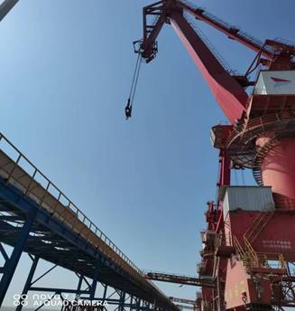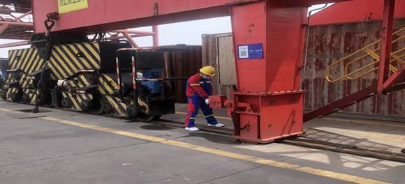 隨著一聲指令的下達,演練正式開始,糧食碼頭1#泊位“騰海明宇”輪作業(yè)過程中突然接上級通知,碼頭1小時后將突發(fā)強對流天氣,伴有雷電、大風、暴雨等緊急情況。現(xiàn)場調(diào)度立即啟動突發(fā)極端天氣機械設備防風錨定應急預案,門機停止作業(yè)、抓斗降至碼頭面、更換鉤頭、放下行走錨定,保障人員拉起門機防風拉索、安全巡查員對各處防風錨定情況進行再檢查、作業(yè)車輛就地停車并開啟雙閃、設備維護組人員全部保持待命搶修狀態(tài)。在場人員分工明確、各司其職、井然有序,僅用10分鐘,所有機械錨定任務全部完成,所有作業(yè)人員撤離到安全區(qū)域進行復盤點評,演練圓滿結束。