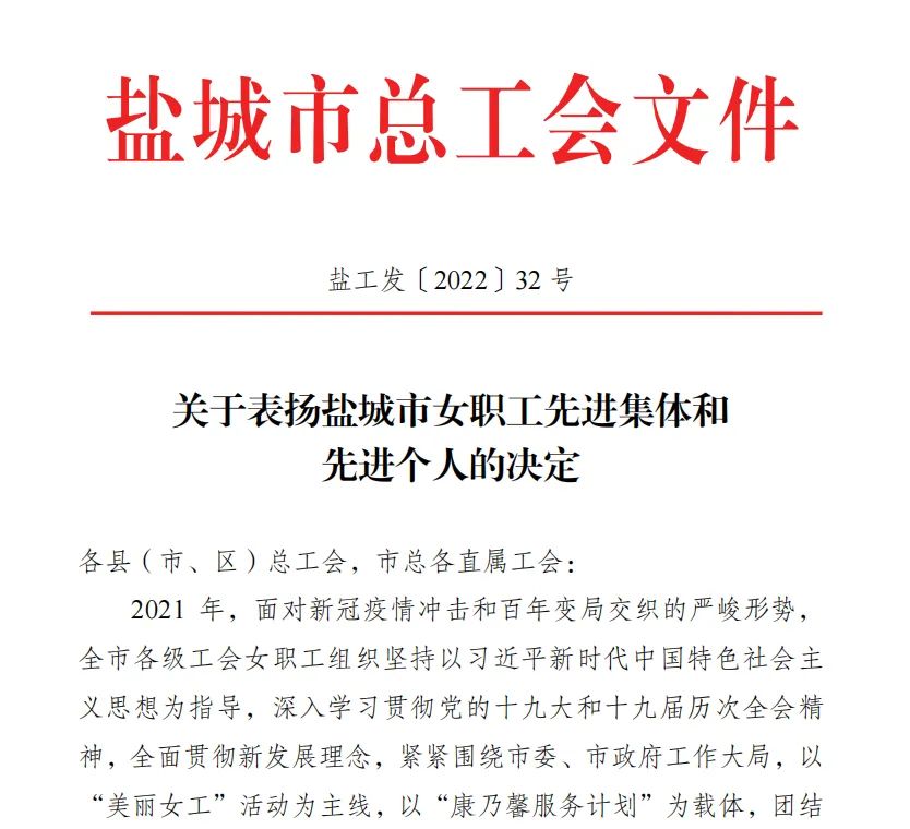 近日,市總工會發布《關于表揚鹽城市女職工先進集體和先進個人的決定》,袁欣同志、江蘇鹽城港集裝箱物流有限公司業務部,分別獲得“鹽城市五一巾幗標兵”“鹽城市五一巾幗標兵崗”榮譽稱號。