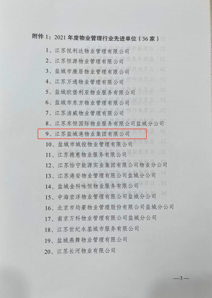 近日,鹽城市物業(yè)管理行業(yè)協(xié)會(huì)對(duì)全市物業(yè)管理行業(yè)先進(jìn)單位和先進(jìn)個(gè)人進(jìn)行了表彰,江蘇鹽城港物業(yè)集團(tuán)有限公司獲評(píng)“2021年度物業(yè)管理行業(yè)先進(jìn)單位”榮譽(yù)稱(chēng)號(hào)。