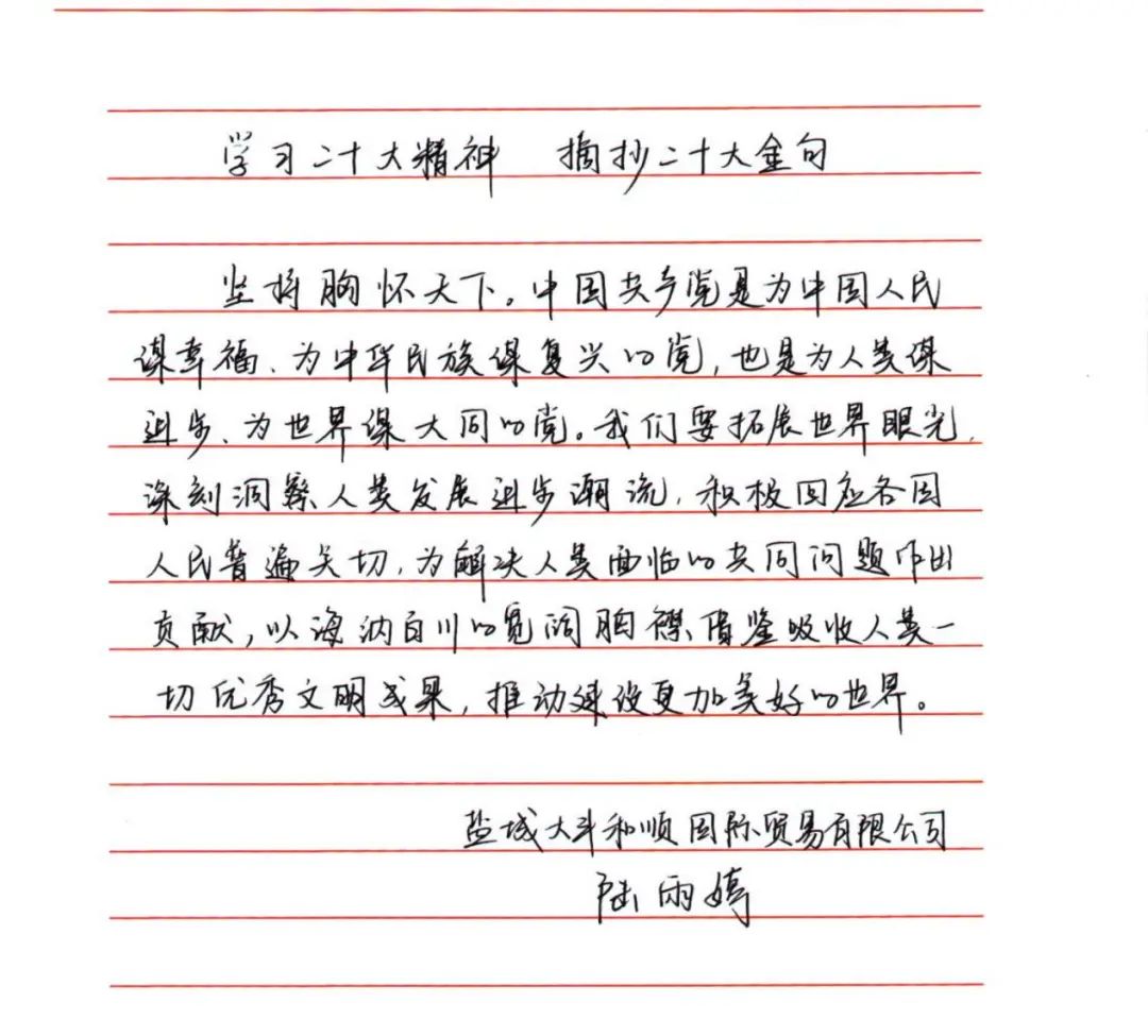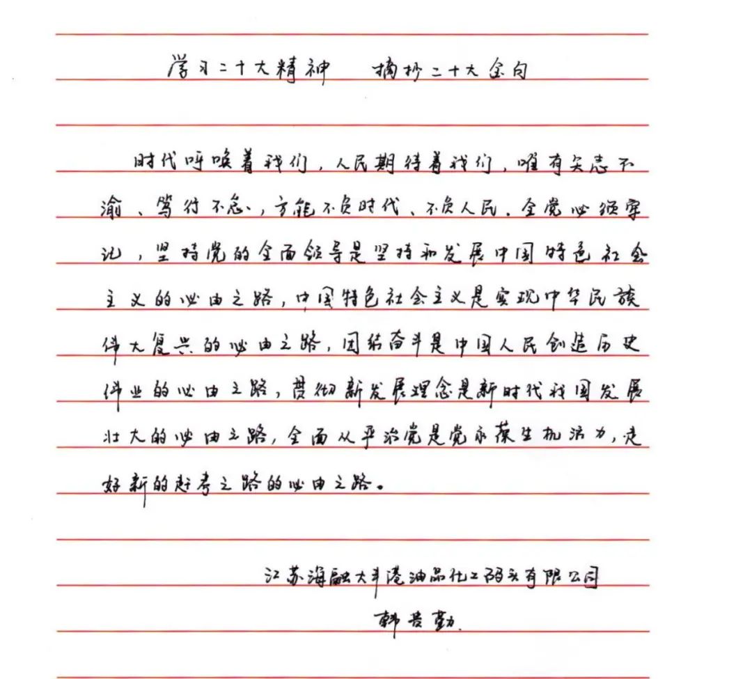 為深入學習宣傳貫徹黨的二十大精神,切實把思想和行動統一到黨的二十大精神上來,使黨員干部做到“學原文、悟原理、知原義”。近日,江蘇大豐港和順科技股份公司黨支部組織開展手抄黨的二十大報告“金句”活動,黨員干部積極參加、以筆抒懷,用特別的方式書寫對黨的赤誠忠心。