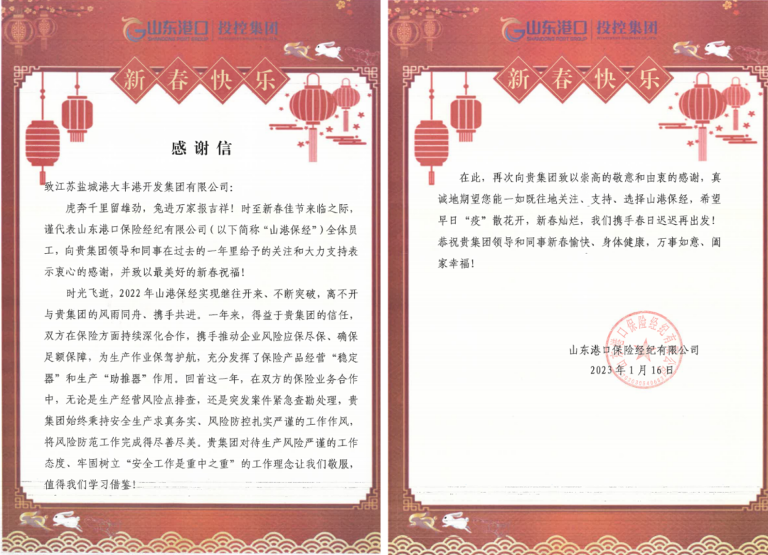 賀信指出,2022年山東保經(jīng)與鹽城港大豐港開發(fā)集團、港口公司和航運集團在保險業(yè)務合作中,無論是航運保險統(tǒng)籌謀劃,還是風險防控保障落實,對集團牢固樹立“安全工作是重中之重”的工作理念給予了充分肯定;對始終秉持安全生產(chǎn)求真務實、風險防控扎實嚴謹?shù)墓ぷ髯黠L更是大加贊揚。希望在新的一年里,雙方在保險方面持續(xù)深化合作,攜手推動企業(yè)風險應保盡保,確保足額保障,為生產(chǎn)作業(yè)保駕護航,充分發(fā)揮保險產(chǎn)品經(jīng)營“穩(wěn)定器”和生產(chǎn)“助推器”的作用。賀信中句句傳遞著山東保經(jīng)對集團工作的肯定,更是送上了新春佳節(jié)的祝福。