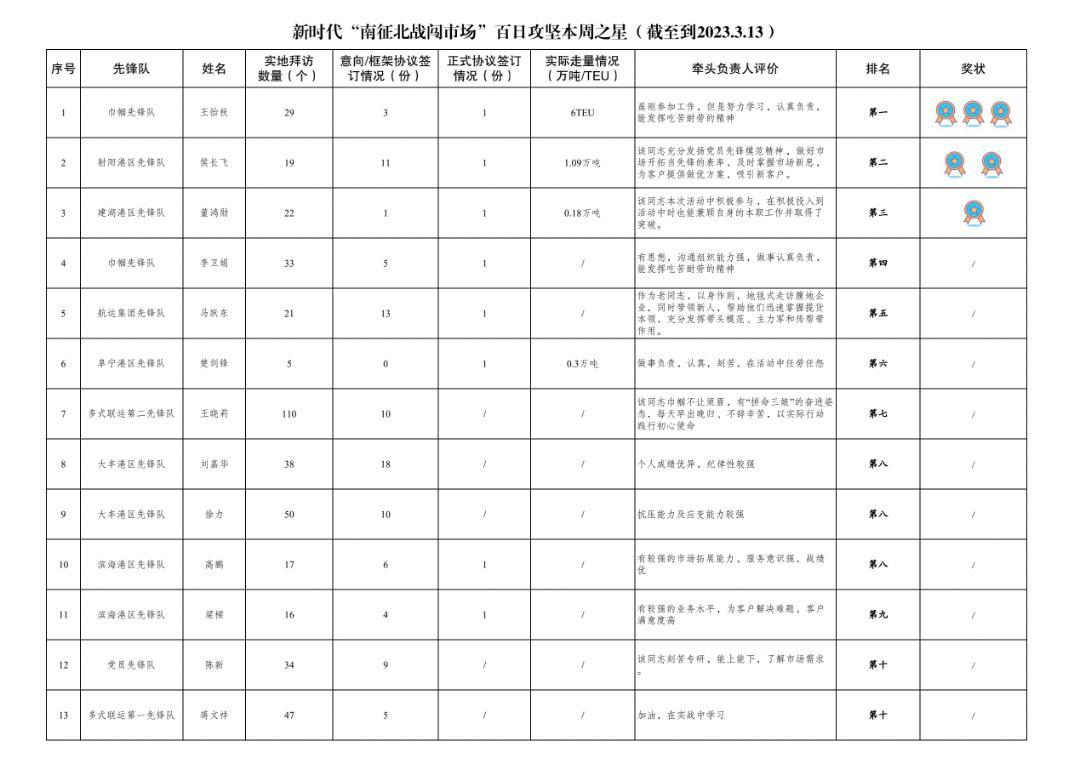 1.累計拜訪客戶數量1179家:其中大豐港區先鋒隊199家,多式聯運第二先鋒隊192家,黨員先鋒隊119家,響水港區先鋒隊99家,濱海港區先鋒隊97家,巾幗先鋒隊89家,射陽港區先鋒隊75家,亭湖港區先鋒隊63家,濱海港區先鋒隊61家,多式聯運第一先鋒隊55家,青年先鋒隊51家,阜寧港區先鋒隊48家,航運集團先鋒隊31家。