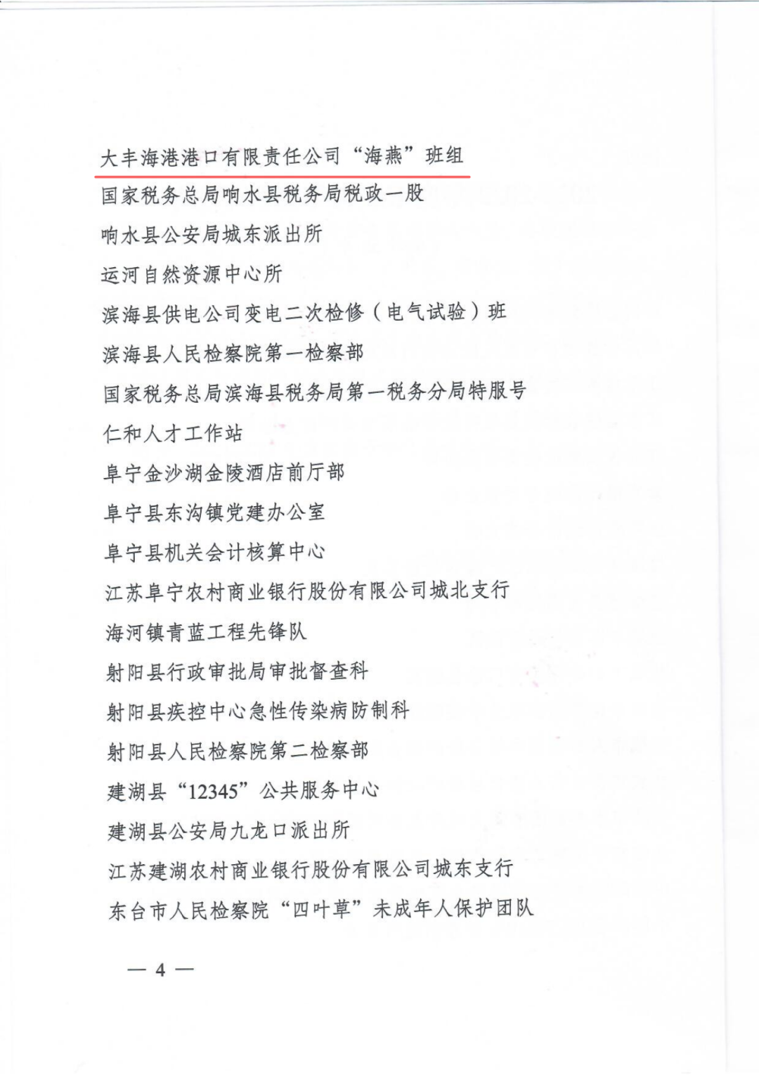 近日,共青團鹽城市委發布《關于命名2021-2022年度市級青年文明號的決定》,鹽城港航運集團生產操作創新團隊、大豐海港港口有限責任公司“海燕”班組以優異的表現榮獲“2021-2022年度市級青年文明號”稱號。