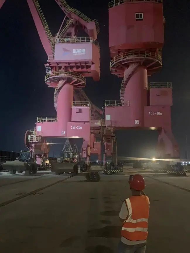 “5#門機(jī)入軌正常”“行走機(jī)構(gòu)壓輪正常”“回轉(zhuǎn)、起升、變幅機(jī)構(gòu)運(yùn)行正常”隨著現(xiàn)場指揮員對講機(jī)里傳來各機(jī)構(gòu)一切正常運(yùn)行的報告,經(jīng)過10個晝夜的連續(xù)奮戰(zhàn),鹽城港射陽港區(qū)碼頭門機(jī)移位作業(yè)宣告完美收官。