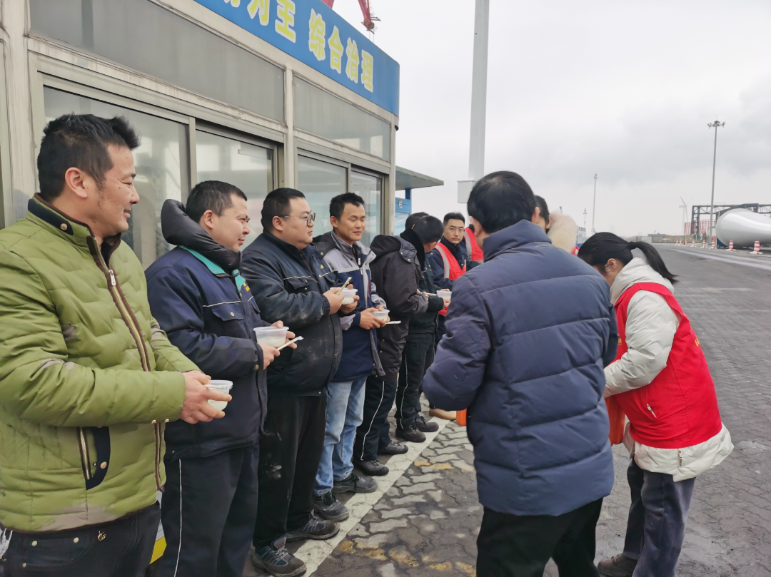 頂著凜冽寒風(fēng),射陽港區(qū)工會為大家送上熱氣騰騰的芝麻湯圓。每一顆香甜軟糯的湯圓都包含著衷心的祝福,醞釀著前行的暖意。