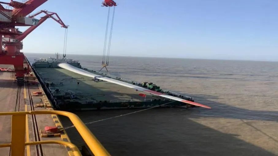 近日,在鹽城港大豐港區(qū)通用碼頭2#泊位上演了一場(chǎng)風(fēng)電葉片的吊裝大片。兩套116米巨龍般的風(fēng)電葉片,隨著吊裝繩索穩(wěn)穩(wěn)吊放在“盛達(dá)98”輪甲板上,標(biāo)志著本次風(fēng)電葉片作業(yè)任務(wù)順利完成,起航運(yùn)往廣西防城港。