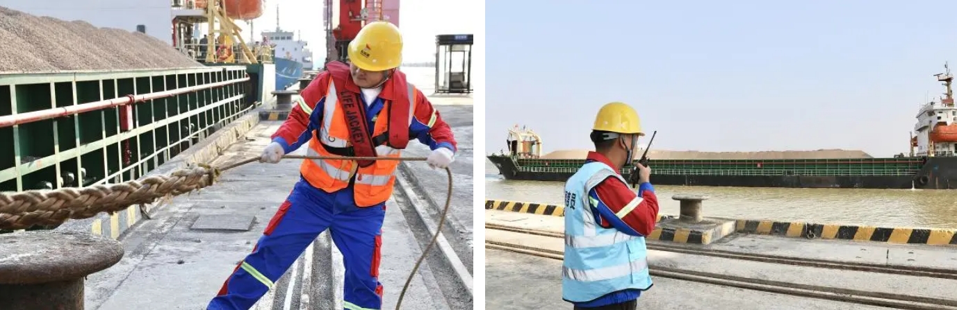 黃黑相間的泊位上停泊著安全回家的貨輪,藍色的港灣為他們提供了一次次的靠泊