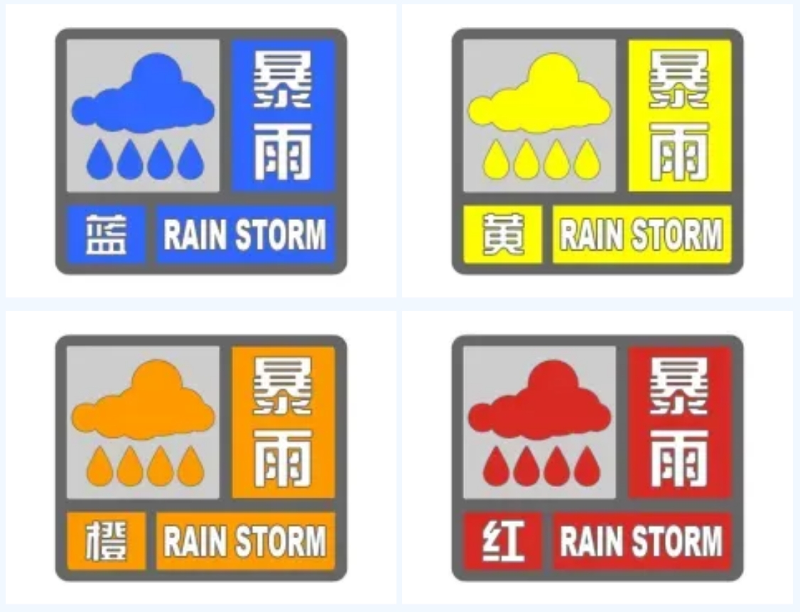 中國氣象上規(guī)定,24小時降水量為50毫米或以上的雨稱為“暴雨”。按其降水強度大小又分為三個等級,即24小時降水量為50~99.9毫米稱“暴雨”;100~250毫米之間為“大暴雨”;250毫米以上稱“特大暴雨”。暴雨預警信號的等級分為四個等級,Ⅳ級(一般)、Ⅲ級(較重)、Ⅱ級(嚴重)、Ⅰ級(特別嚴重),分別用藍色、黃色、橙色、紅色中英文圖標標識。