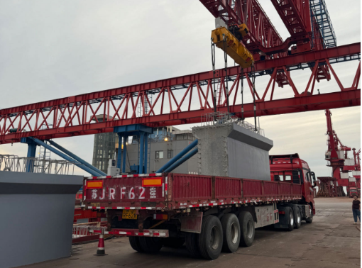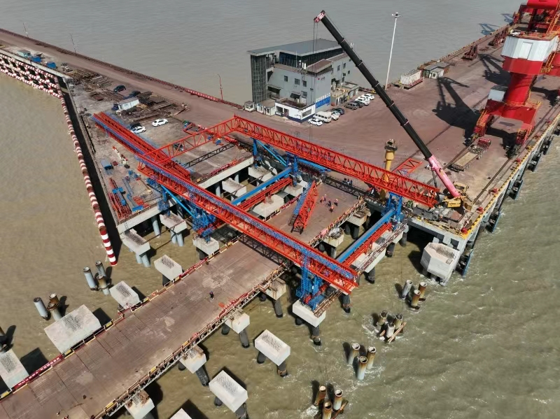 研發和升級新型碼頭施工裝備——一體化智能提梁機,通過橫移與縱移機構實現天車在橫縱梁范圍內的全方位行走,從而進行吊梁作業。與傳統浮吊相比,每榀梁安裝時間從2小時縮減至15分鐘,把“水上施工”轉換到“陸地施工”,消除了海浪對施工造成的影響,有效提升施工質量。