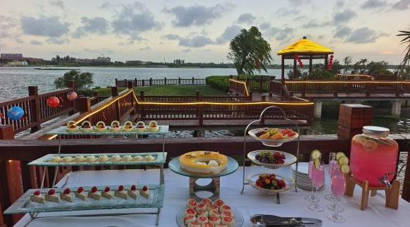 金秋戶外賞月活動現場,酒店精心布置了日月湖畔中庭區域,如嫦娥奔月的壁畫、玉兔造型的擺件等,綢緞臺面上擺滿了各種精致的月餅、新鮮的水果和香醇的茶點,周圍點綴著璀璨的燈光,處處洋溢著濃厚的節日氛圍?,F場的小游戲環節,顧客們踴躍參加,更是將整個活動氛圍推向了高潮。