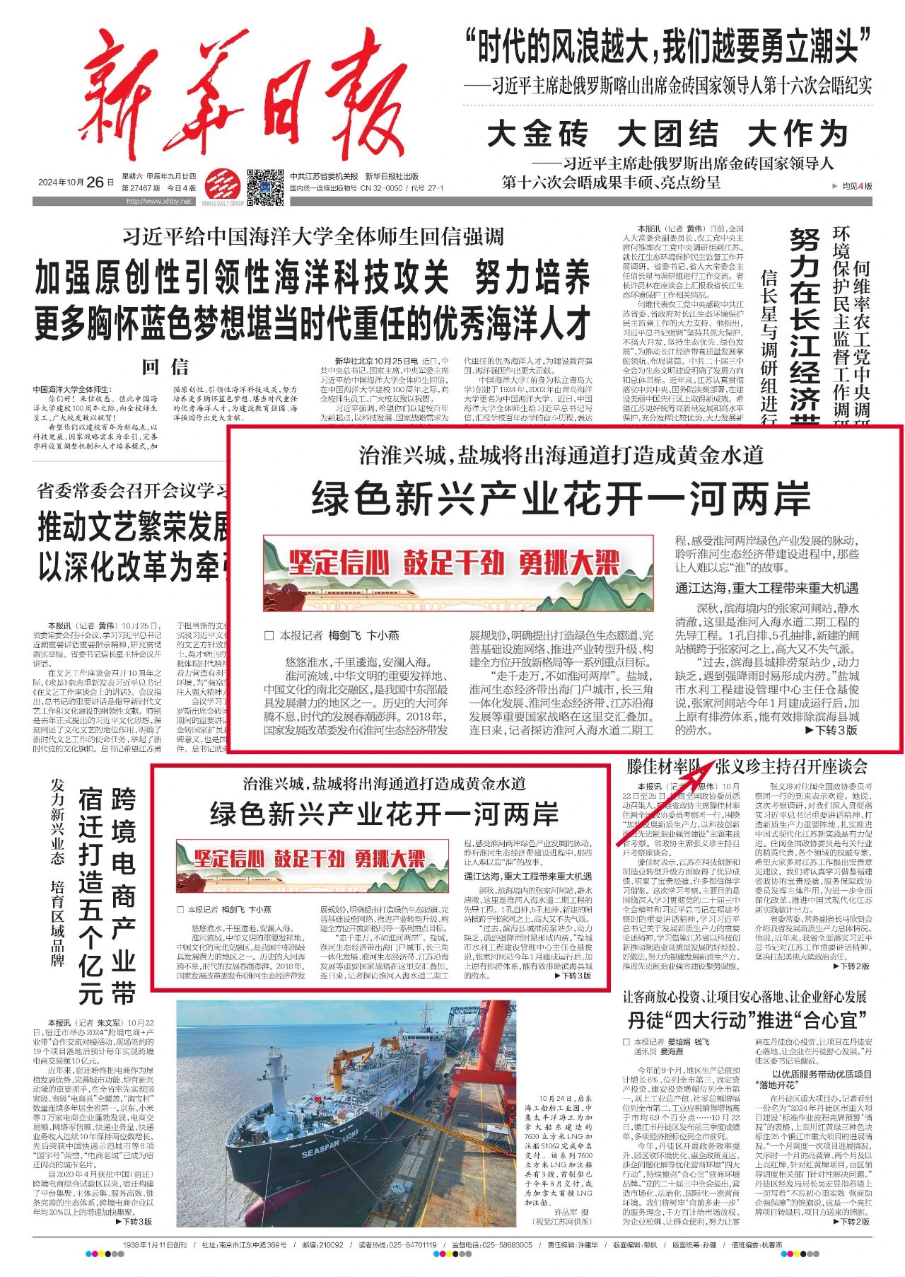 《新華日報》頭版聚焦鹽城治淮興城,鹽城將出海通道打造成黃金水道