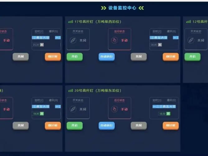 為深入貫徹國家“雙碳”目標,射陽港區聚焦節能降耗、高效運行為抓手,利用4G遠程模塊聯動PC端或微信小程序,實現港區高桿燈照明系統的集中控制管理,根據生產需求合理開關作業區域高功率燈具,既降低了人工煩瑣操作,又有效降低電力消耗減少能源浪費,延長燈具的使用壽命。據了解,港區20桿高桿燈,每日開啟平均約8桿高桿燈,每年可節約電量103680KWh,節約電費8萬余元,經濟效益顯著。