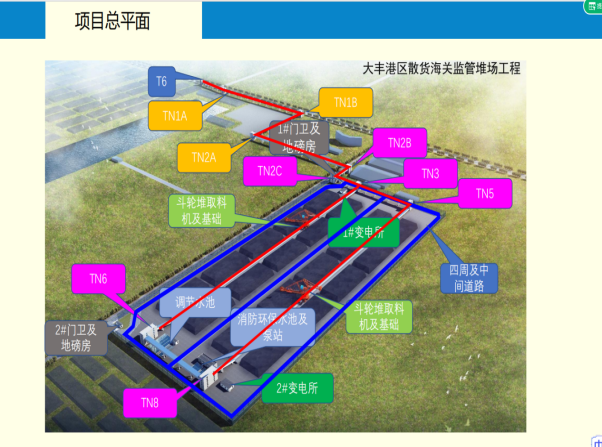 該項目陸域用地面積25.03萬㎡,其南北向縱深約736.83米,東西向寬度則約為318.97米。作為大豐港區(qū)重點工程的一部分,該項目從二期散貨堆場已建的T6轉運站預留的2路皮帶機接口延伸而來,旨在通過T6轉運站皮帶機的延伸及大豐港現(xiàn)有臨時堆場用地范圍內相應配套設施的建設,進一步提升港口的功能性和效率。