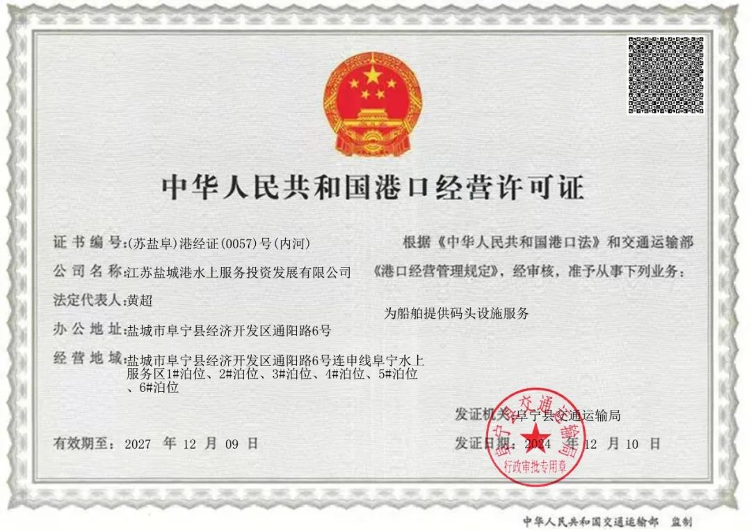阜寧水上服務區順利取得港口經營許可證
