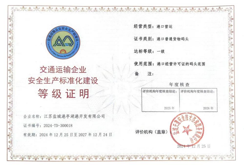 近日,陸港集團亭湖港區(qū)順利通過交通運輸企業(yè)安全生產(chǎn)一級標準化驗收,并取得一級標準化認證證書。這標志著陸港集團在內(nèi)河港區(qū)安全生產(chǎn)管理方面邁上新臺階。