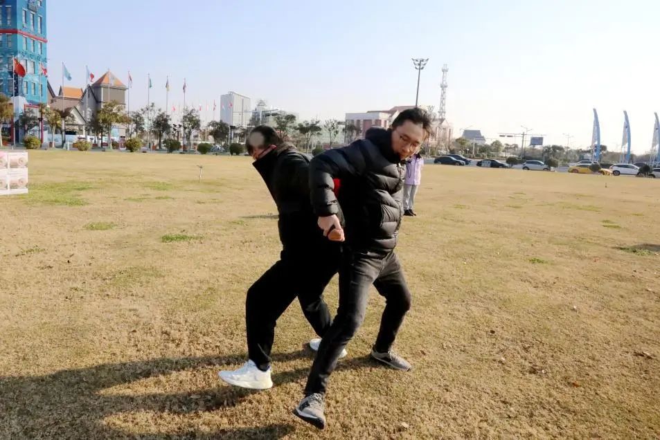 第四棒同舟共濟(三人四足),選手們互相搭著肩膀,喊著“一二、一二”整齊有序的口號奮力前行。隊友們跟隨著一起奔走,現場氣氛緊張而熱烈。