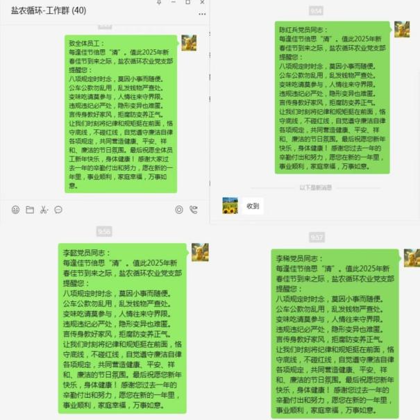 鹽農(nóng)循環(huán)農(nóng)業(yè)堅(jiān)持早研究、早部署、早警示,以節(jié)前“廉”動為抓手,持續(xù)營造風(fēng)清氣正的節(jié)日氛圍,節(jié)前發(fā)送廉潔提醒短信,將警示提醒融入溫馨祝福之中引導(dǎo)全體黨員干部、群眾把好“廉潔關(guān)”繃緊“廉潔弦”。