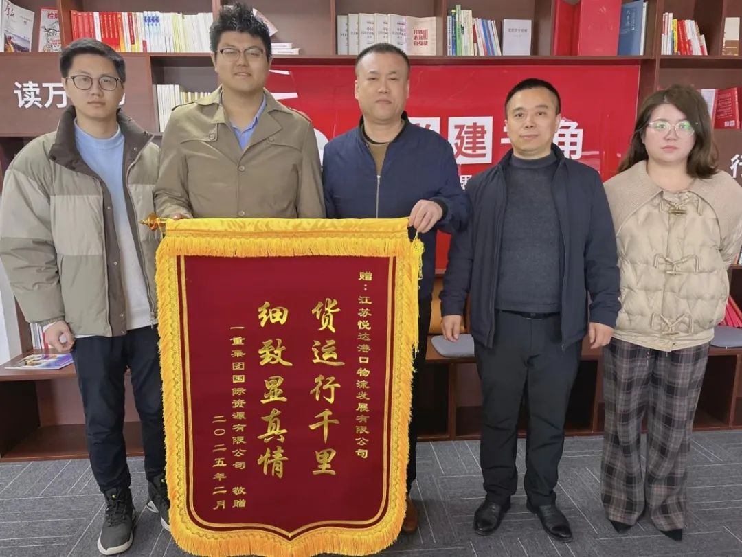 近日,一重集團國際資源有限公司為江蘇悅達港口物流發展有限公司送上一面錦旗,贈語“貨運行千里,細致顯真情”。這簡短的話語,飽含著客戶沉甸甸的信任與感激。