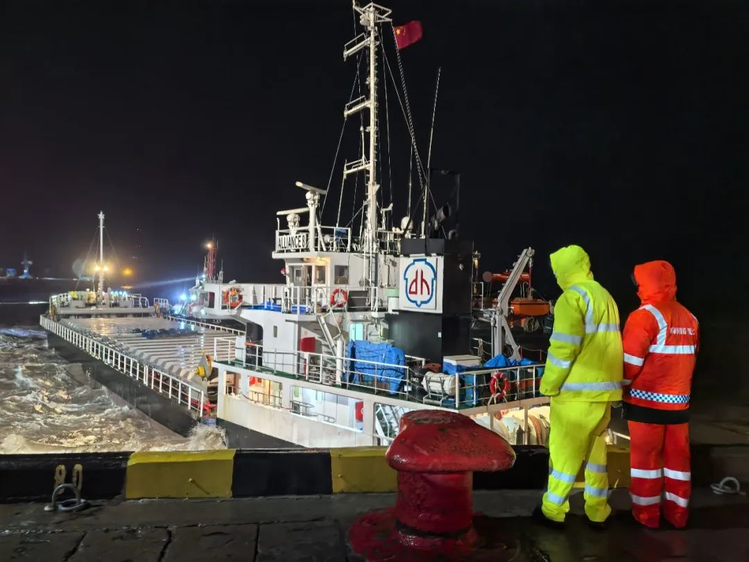當(dāng)晚正值農(nóng)歷大潮汛,東北風(fēng)6級、涌浪2米的惡劣海況給救援帶來嚴(yán)峻挑戰(zhàn)。引航員抵達(dá)現(xiàn)場時,“聯(lián)盟8”輪船頭僅剩1根倒纜受力,船體與碼頭形成60°夾角持續(xù)后漂,且涌浪過大導(dǎo)致無法登輪指揮。面對險情,引航員在碼頭前沿與交管中心協(xié)同決策,果斷采取“解尾纜、控船位”的應(yīng)急處置方案。
