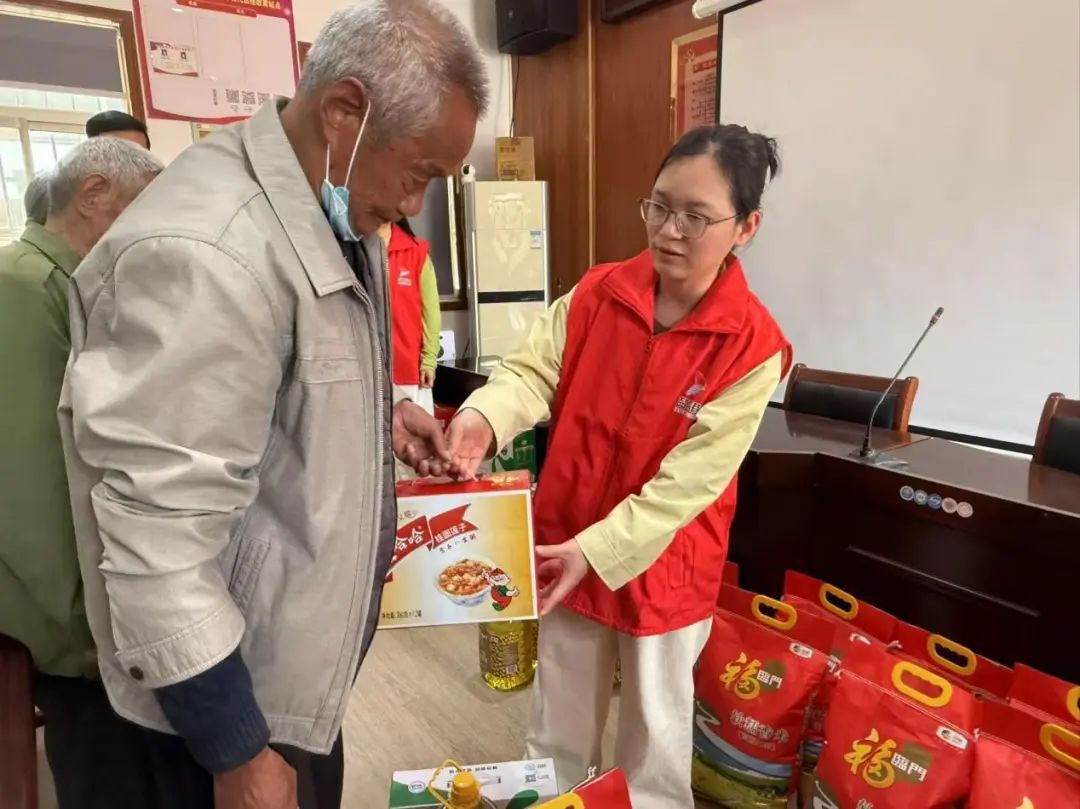 當(dāng)員工們將大米、食用油、牛奶、保暖用品等生活物資逐一遞到老人手中時,現(xiàn)場響起了陣陣掌聲。