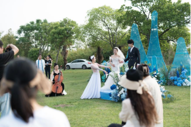 婚禮秀以“潮汐”“云端”為核心意象,將港口元素與婚禮藝術深度結合。室內環節通過宣傳視頻展現“吃住行游購娛”文旅產業鏈與酒店五星級服務理念,戶外秀場則以大提琴演奏《有海浪聲音的大提琴》、舞蹈《云與海的相遇》等沉浸式演出,打造“海風輕拂、云影婆娑”的夢幻氛圍。新人登場時以“海港”“小云”為角色設定,誓言卡融入“潮汐的港灣”“穿越云海的勇氣”等港口文化符號,讓愛情敘事與港口特色交相輝映,營造出“海天共鑒”的浪漫場景。