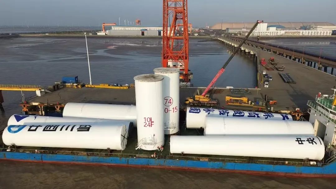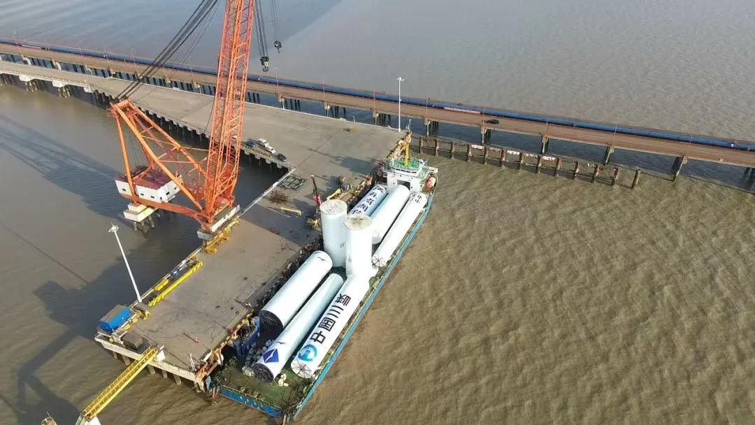 近日,隨著最后一件長31.6米、直徑6.6米、重146.3噸的風電塔筒穩穩落在“云舟之星”輪甲板上,標志著智慧港口公司散貨碼頭分公司創新的雙套風電塔筒裝船工藝成功應用實踐。