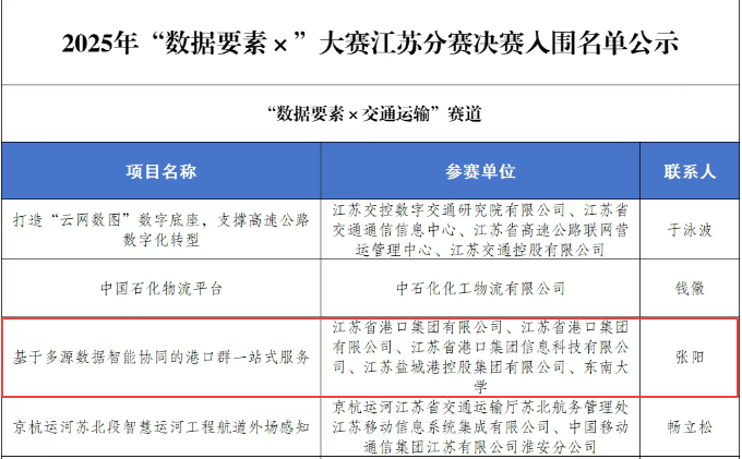 近日,2025年“數(shù)據(jù)要素×”大賽江蘇分賽決賽入圍名單公示,由省港口集團(tuán)、鹽城港集團(tuán)、東南大學(xué)聯(lián)合申報(bào)的《基于多源數(shù)據(jù)智能協(xié)同的港口群一站式服務(wù)》項(xiàng)目,成功入圍2025年“數(shù)據(jù)要素×”大賽江蘇分賽決賽。