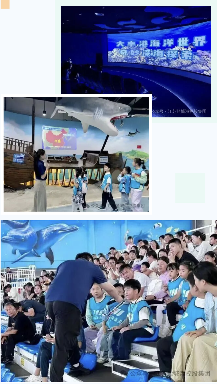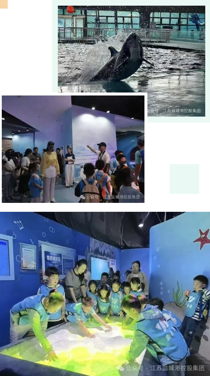 最后,孩子們踏入升級后的大豐港海洋世界科技館,沉浸式體驗瞬間拉滿——VR實景秒變“海盜王”、5D星空影院帶你“魂穿”深海秘境。“海洋世界尋寶”活動一開啟,孩子們化身“尋寶小達人”,歡快穿梭在場館內,“看,我找到一個”“耶!我找到兩個”,歡呼聲此起彼伏。講解員以生動故事拆解復雜科學知識,讓孩子們在互動中主動探索,實現“玩中學、學中悟”。海洋劇場內,主持人進行著海洋知識科普,訓練員與聰明的海豚默契配合演繹著高空華爾茲,讓孩子們在歡笑聲中樹立守護藍色家園的意識。活動尾聲,大家共同回顧全天收獲,分享難忘瞬間,為這場研學之旅畫上圓滿句號。