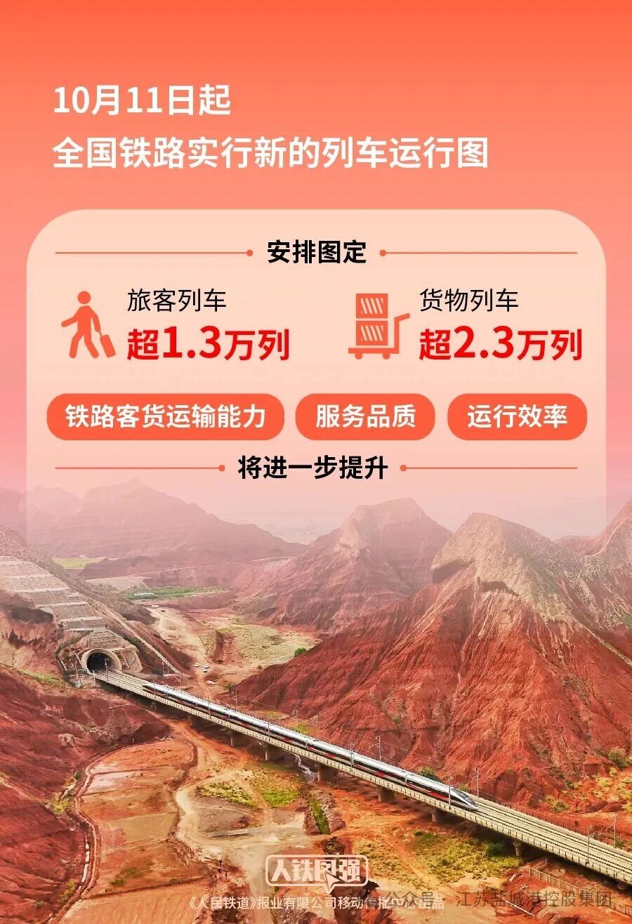 10月11日起,全國鐵路實行新的列車運行圖,保持客貨列車開行規(guī)模,優(yōu)化列車開行結構,安排圖定旅客列車超1.3萬列,貨物列車超2.3萬列,鐵路客貨運輸能力、服務品質和運行效率將進一步提升。