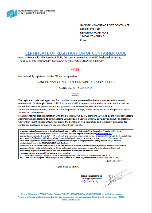 6月10日,從國(guó)際集裝箱局(法國(guó))傳來(lái)喜訊,鹽城港集團(tuán)自備的200只集裝箱,全部完成前綴YCPU的注冊(cè)登記手續(xù)(證書(shū)編號(hào):YCPU-2121),正式成為可以全球流通的集裝箱。自此,鹽城港自備箱在世界上有了自己的名字—“YCPU”,拿到了自己的“環(huán)球通行證”。